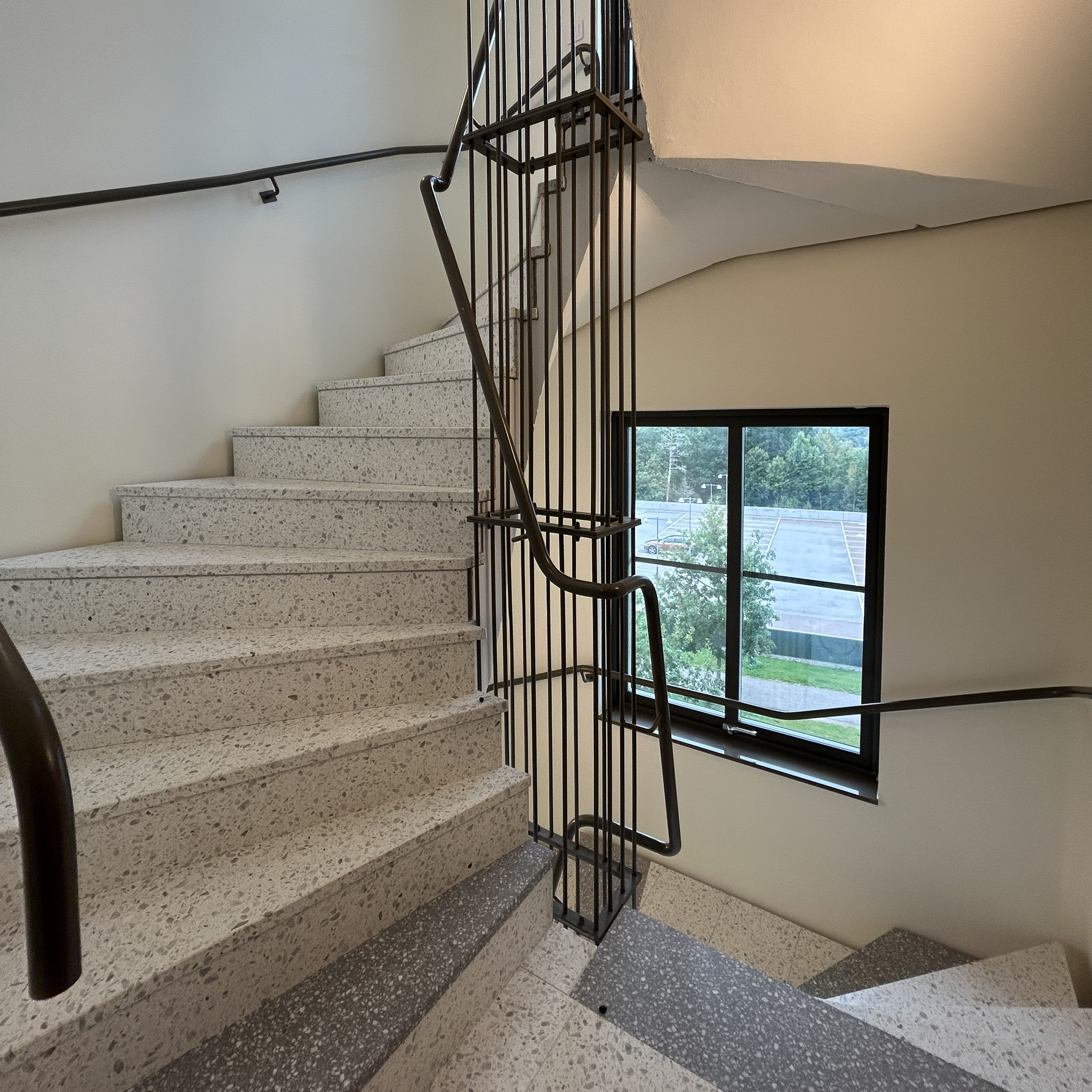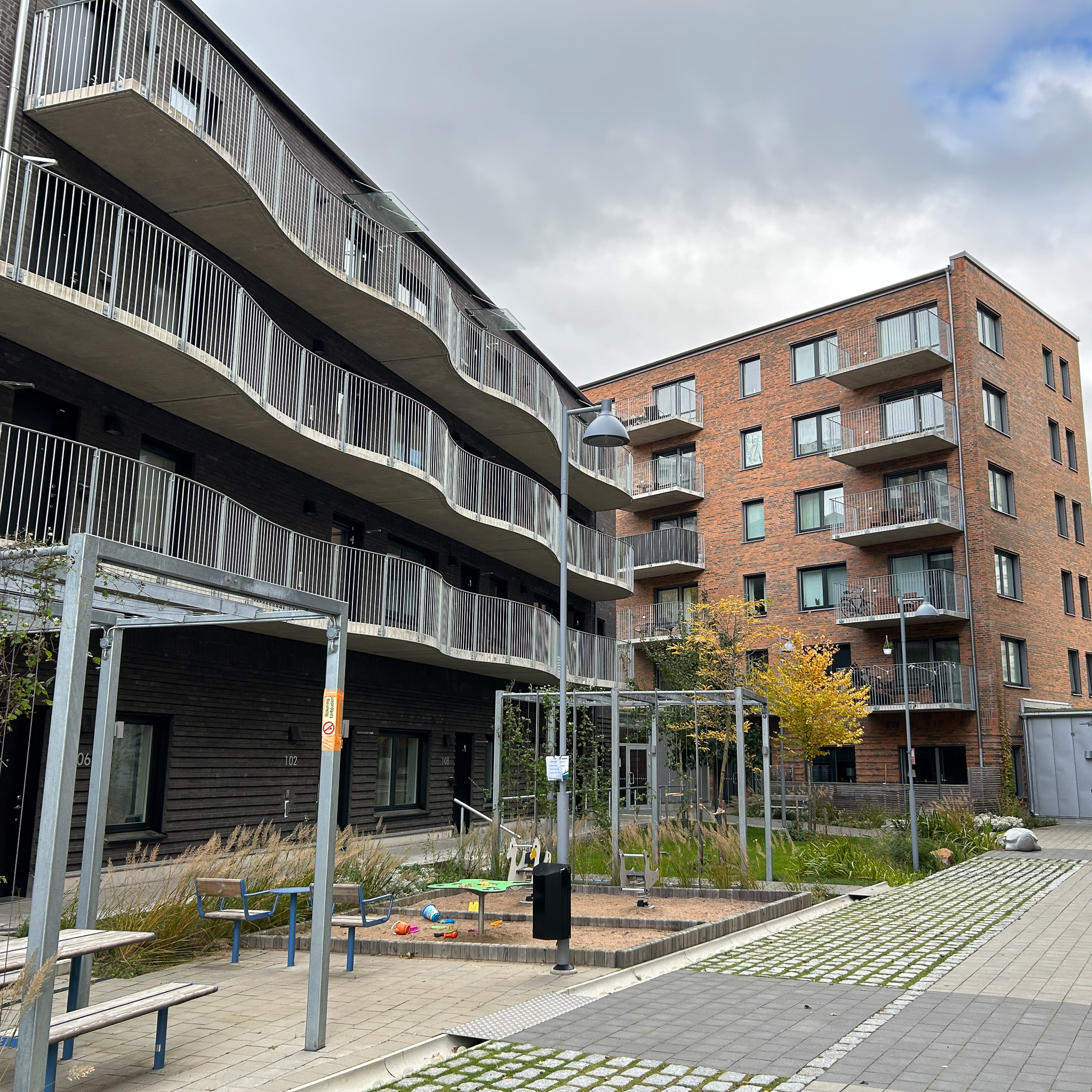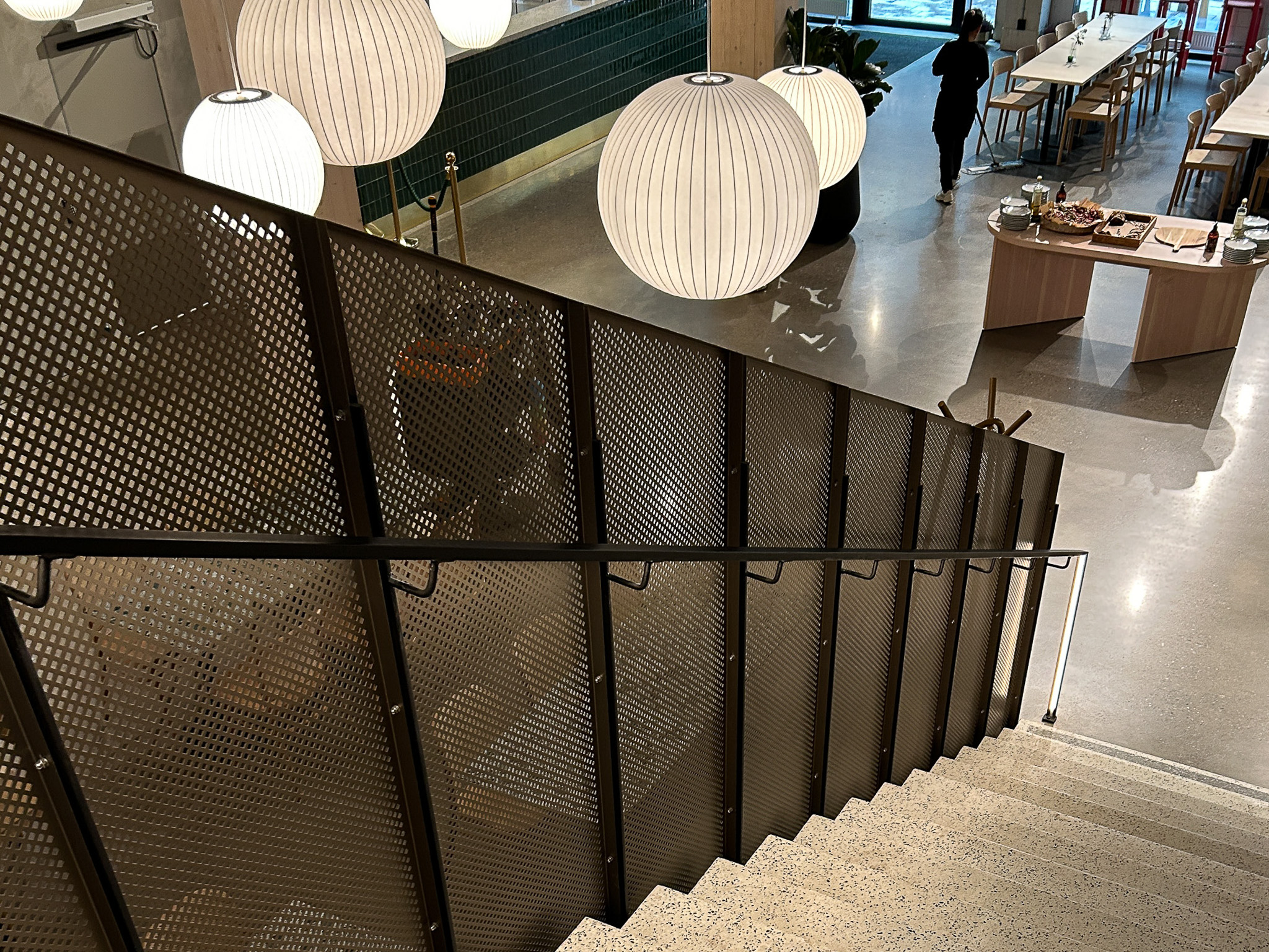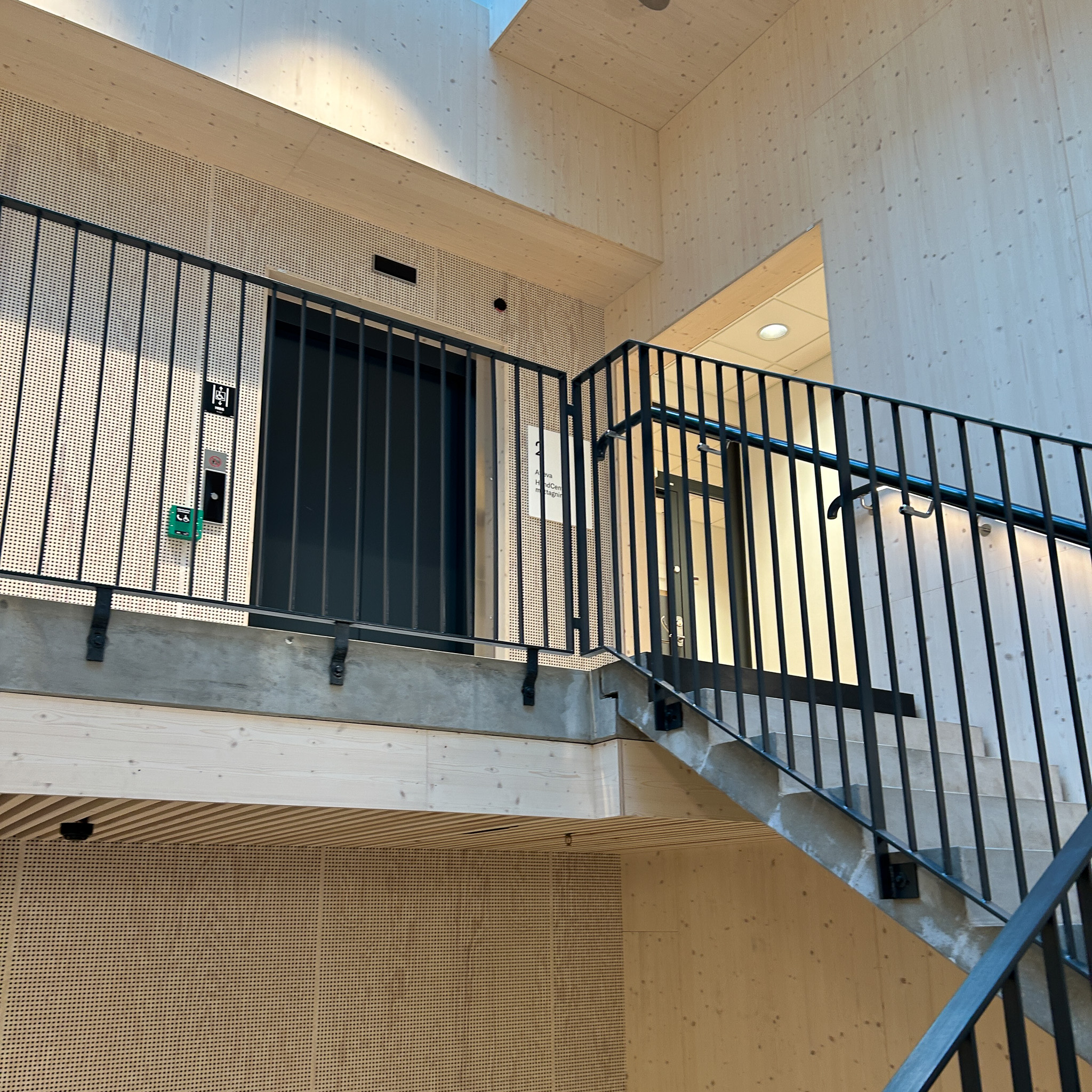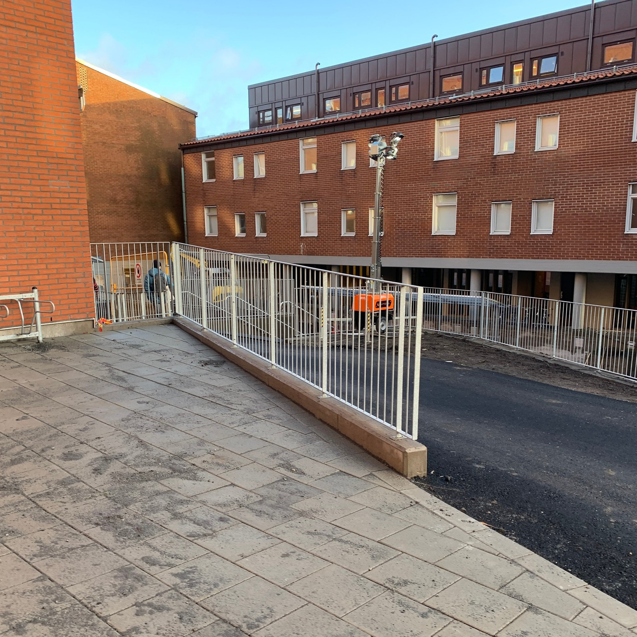 Slitstarka och stilrena räcken i plattstål och runda pinnar för en modern aktivitetsmiljö.